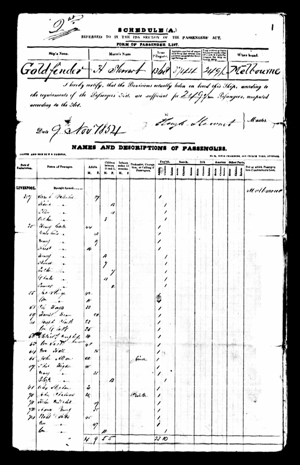 Francis McAteer emigrated to Australia aboard the ship Goldfinder which departed Liverpool England 9th November 1854, carrying 270 passengers and 1,600 tons of cargo, and arrived in Melbourne 1st February 1855.
