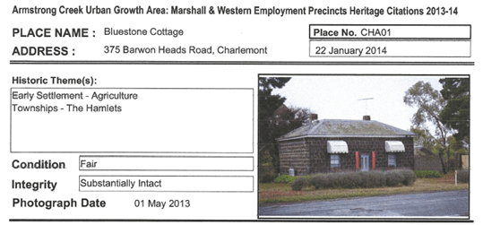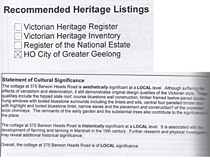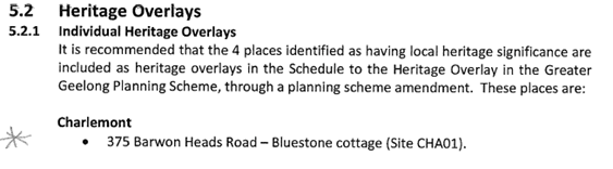 This Study also recommends that the McAteer bluestone cottage should be “included as a heritage overlay in the Schedule to the Heriatge Overlay in the Greater Geelong Planning Scheme”.