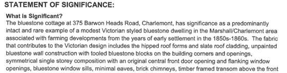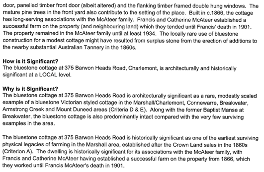 The bluestone cottage at 375 Barwon Heads Road is architecturally significant as a rare, modestly scaled example of a bluestone Victorian styled cottage in the Marshall/Charlemont, Connewarre, Breakwater, Armstrong Creek and Mount Duneed areas (Criteria D & E). (Source 1)
